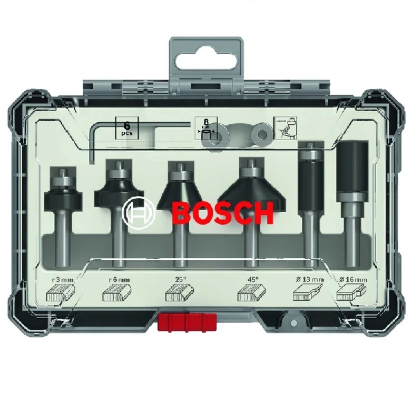 The Bosch 2607017470 Trim & Edging 1/4in Shank Router Bit Set 6pc is the ideal set of bits for carpenters, jointers, and other woodworkers. These edge-working bits are perfect for flush trimming, rounding and chamfering.