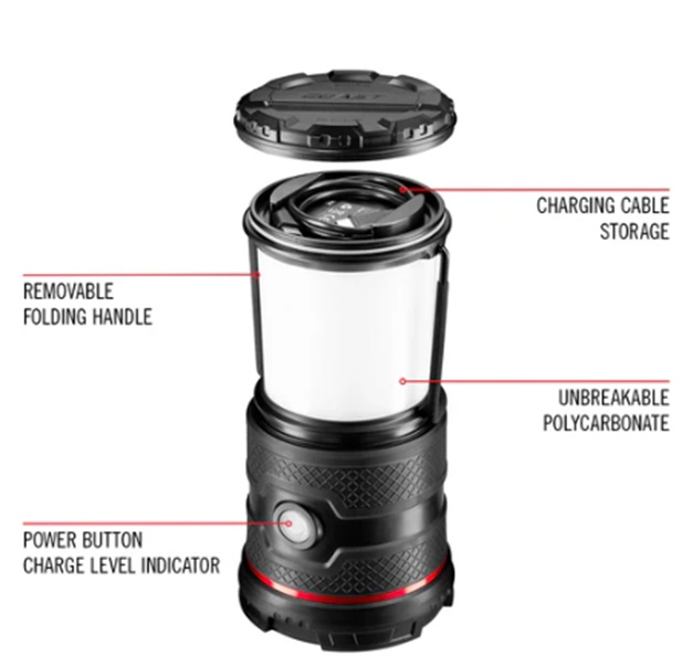 The lantern provides up to 15 hours of runtime on a single charge and offers optional alkaline battery backup for added reliability.
