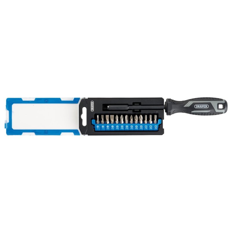 Supplied inside a transparent plastic storage case, which rotates for easy selection of screwdriver bits.