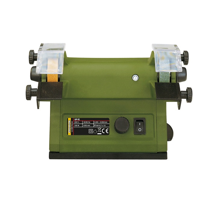Supplied with a 50 x 13mm corundum (grade N) and silicon carbide (soft compound) wheel for general grinding/sharpening and hard materials respectively.
