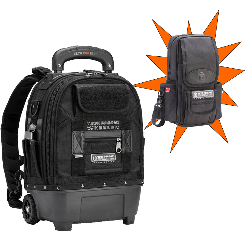 The is a medium-sized rolling tool backpack with an all-black color scheme inspired by the TECH PAC MC BLACKOUT.
