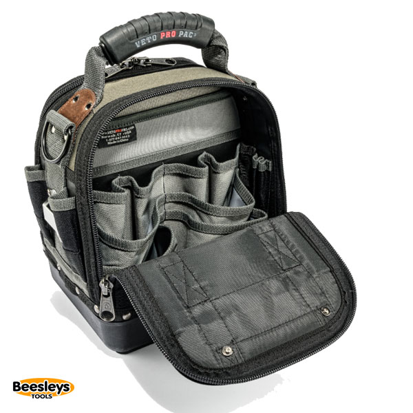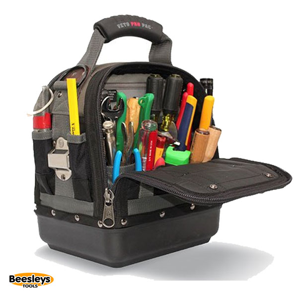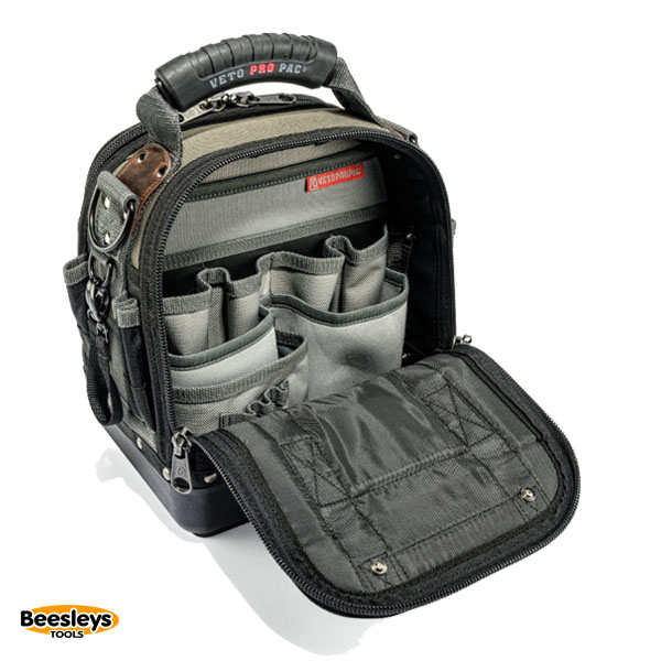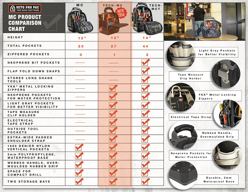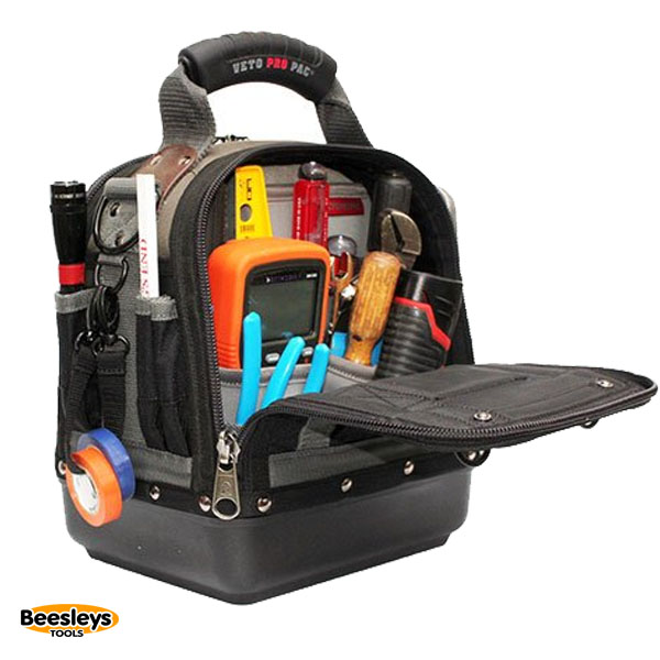 The Tech MC features everything you have come to expect from Veto Pro Pac: Veto Pro Pac™s patented center panel, heavy duty construction and stabilizing injection molded waterproof base that keeps tools dry, even in the nastiest of conditions.